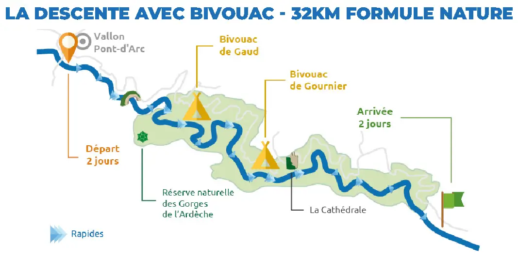 « Vivez l’expérience la plus authentique de l’Ardèche : 2 jours de navigation dans les Gorges et une nuit en bivouac sous les étoiles, au cœur de la Réserve Naturelle. »